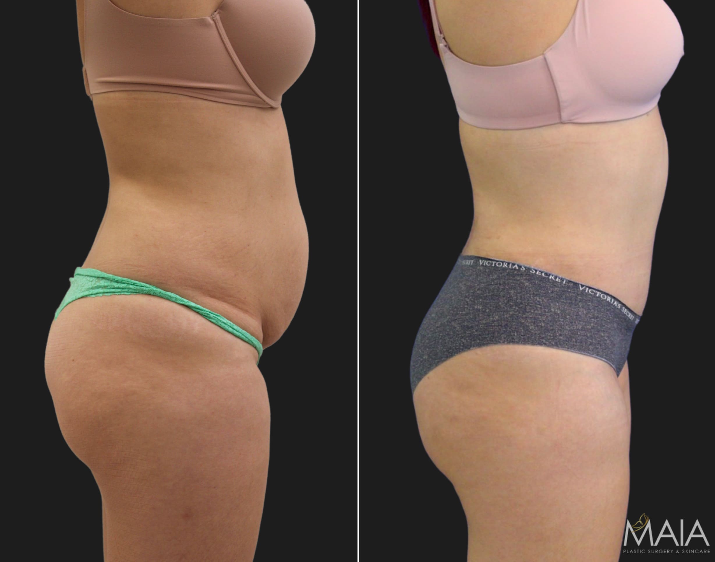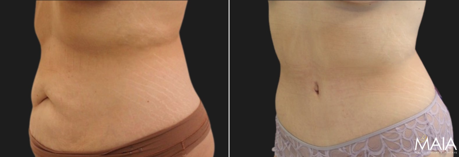 During surgery, a horizontal incision is made from approximately hip bone to hip bone, and a small incision around the belly button. Total incision length and shape depends on the amount of excess skin. Dr. Maia will then remove excess skin and soft tissue and repair or tighten the abdominal muscles. Tummy Tuck can also be combined with liposuction around the flanks and hips to give you a lean appearance with natural-looking contours. If you have stretch marks and scars from prior surgeries, such as a caesarean section or appendectomy, Dr. Maia may be able to arrange your skin and tissue to eliminate them. Sutures, clips, tape, and/or skin adhesives may be used to secure the incisions together.