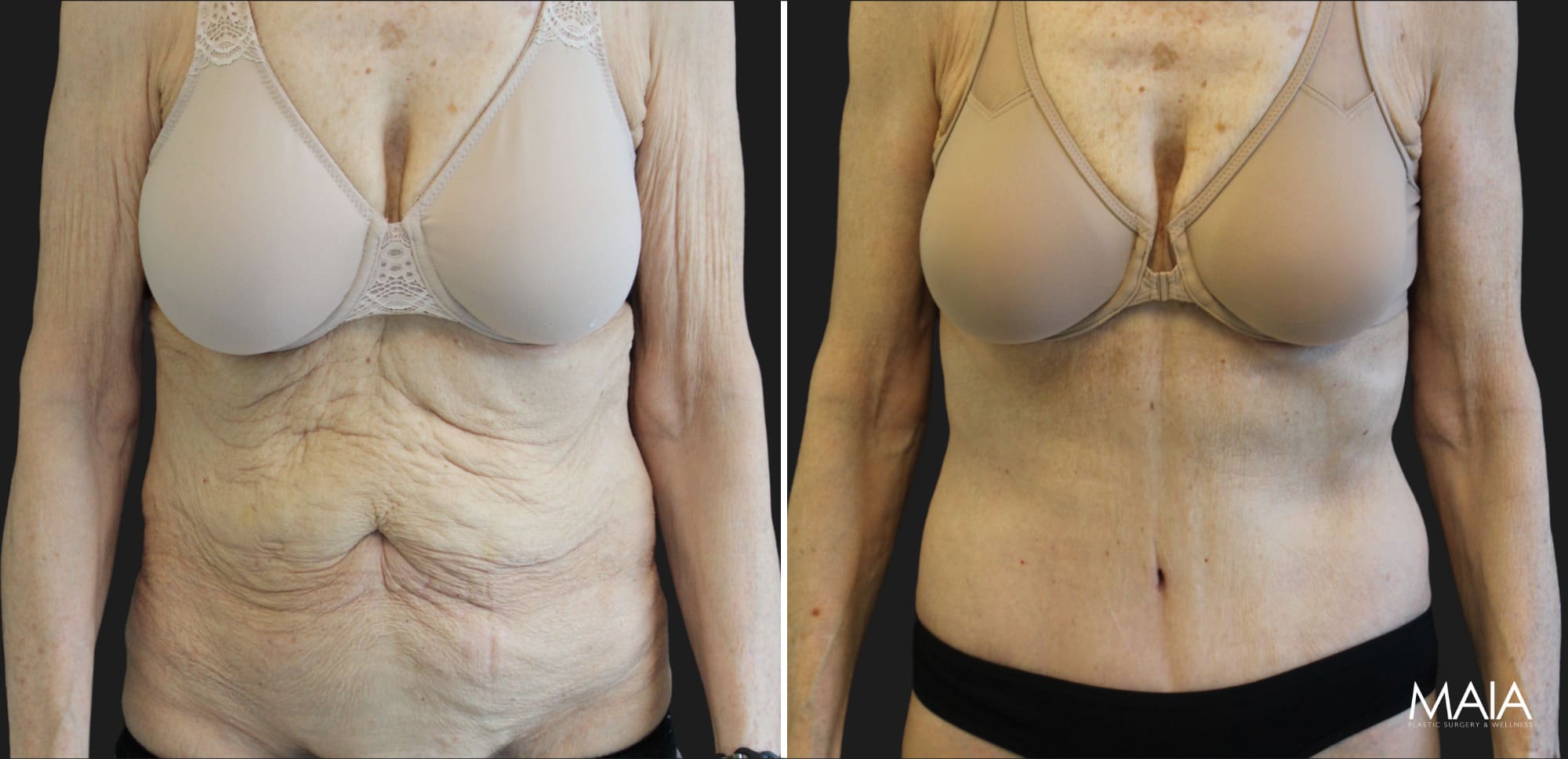 Abdominoplasty / Tummy Tuck Liposuction Hernia RepairMenopause Makeover: Mid 60s patient, mother of 3, before and 4 months after extended tummy tuck, liposuction of the upper back, lower back, and flanks