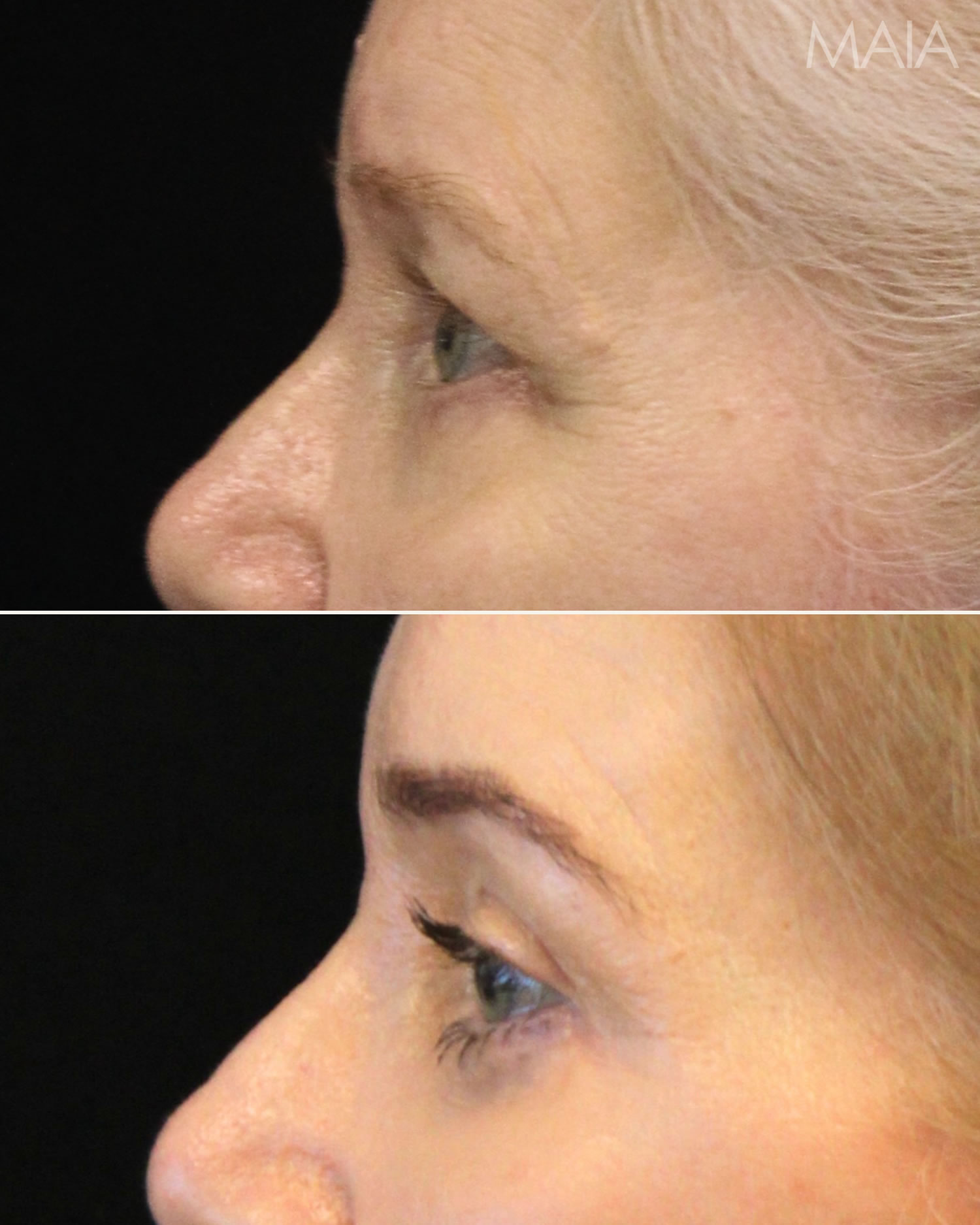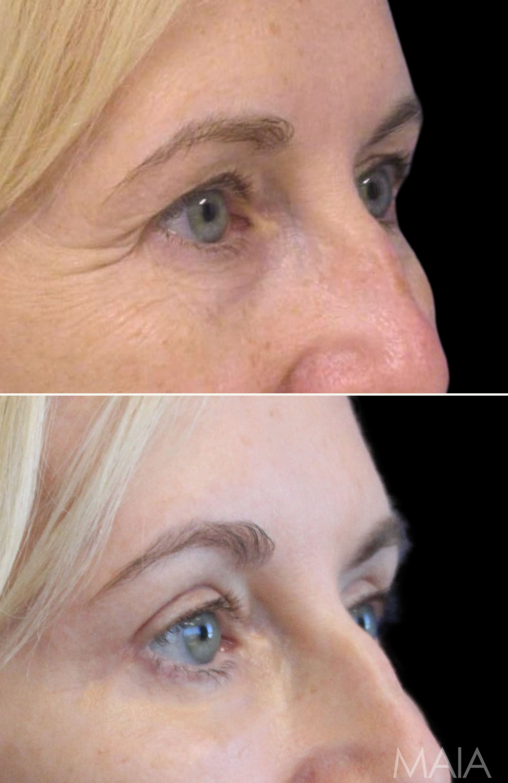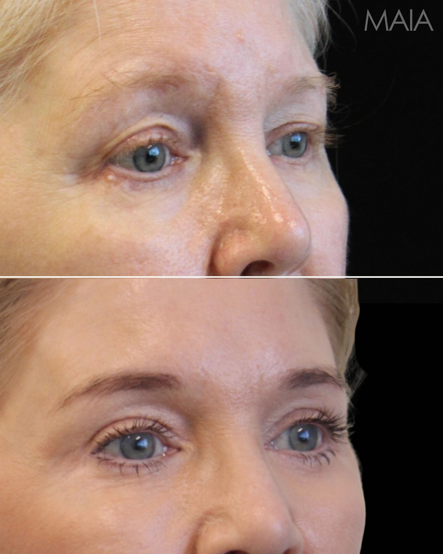 Eyelid Lift (Upper) Eyelid Lift (Lower) Forehead/Brow Lift Fat Transfers TCA Peel55 year-old patient before and 3.5 months after eye rejuvenation (upper and lower blepharoplasty, canthopexy, nanofat grafting) with Dr. Maia in Tysons Corner, Virginia.